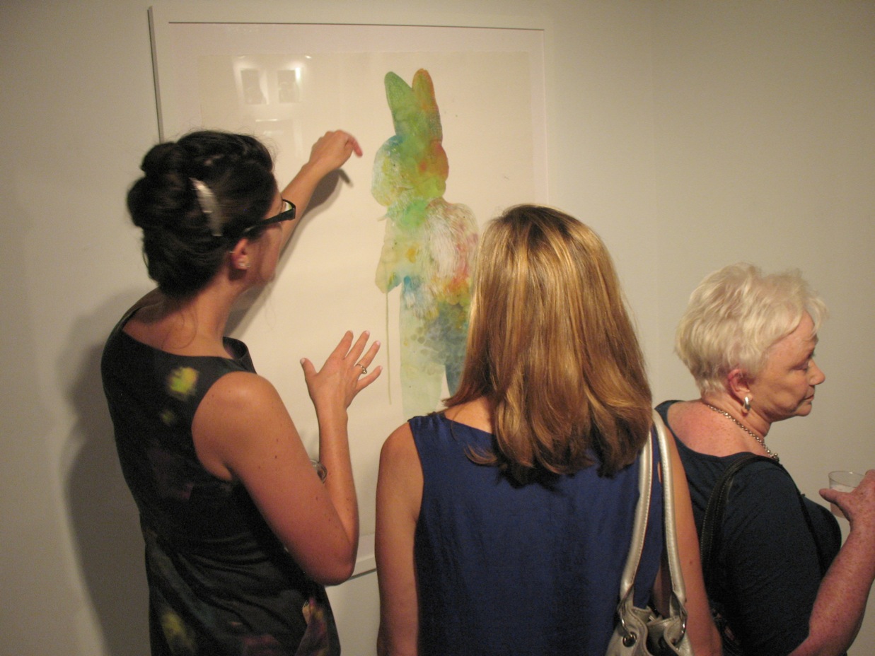 My work is abstract; delicate lines and patches of vibrant color contrast within fluid, muted washes.  Details unfold like an onion.  Hints of the human form are cradled within intangible environments or veiled by an abstract layer applied like lace across the body.  The ethereal nature of each composition breaths in and out of shape as the eye navigates the surface.
